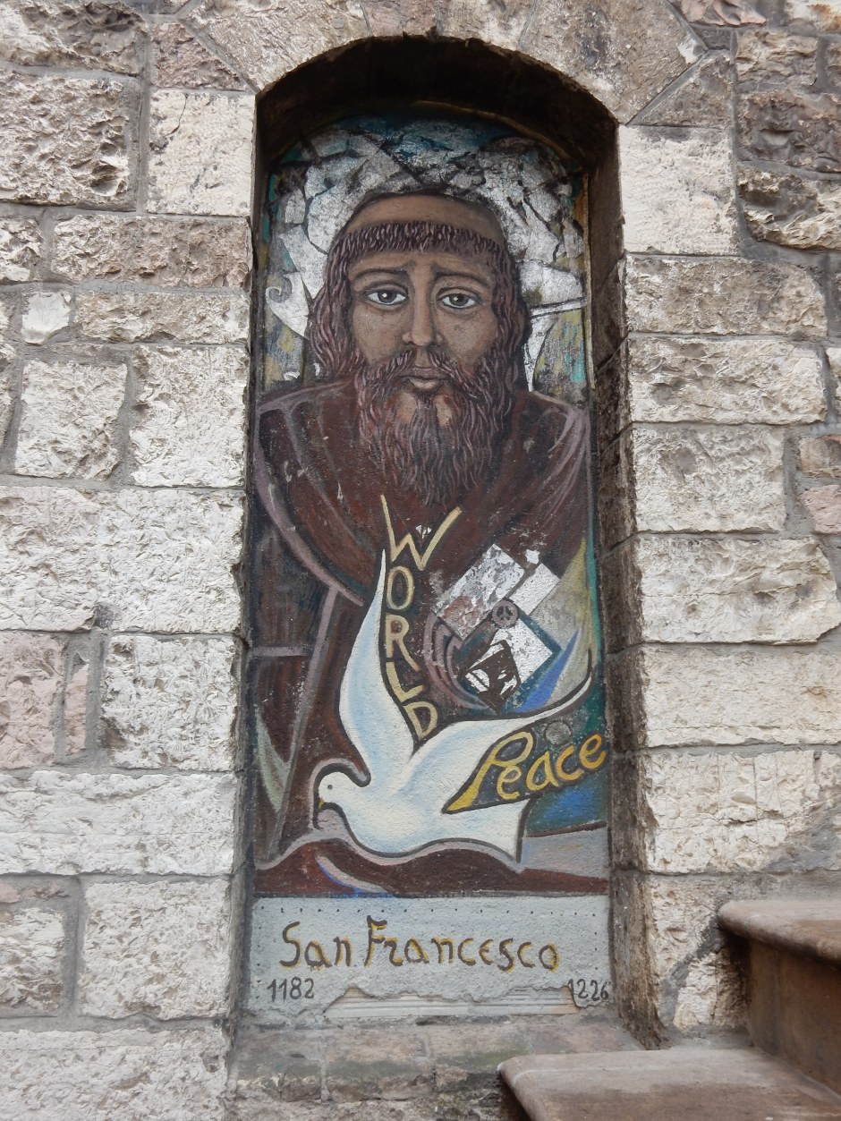 The next morning Loren and I drove to Tordandrea for two nights, in the vibrant valley just below Assisi. We had two long visits to that historic spiritual hillside town, famed home of the medieval Saints, Francesco – Francis and Chiara – Clare. There is so much preserved ancient and medieval history to be found here, for example, the Roman Temple of Minerva, Chiesa di San Damiano, Catedrale di San Rufino, Basilica di Santa Chiara, and so much more. By far, the most captivating were the many tributes to San Francesco all around Assisi, as well as in the valley town called Santa Maria Degli Angeli – Saint Mary of the Angels. Here, an impressive Basilica surrounds the original very simple chapel where Francis lived during the final years of his life.
