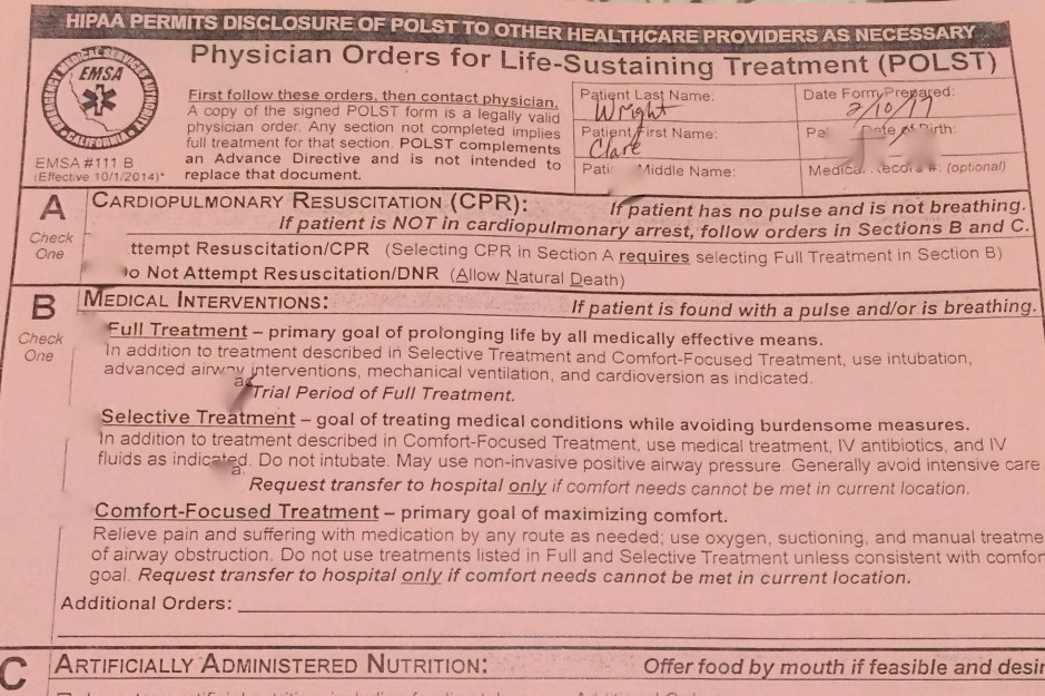 Still in Castro Valley at an AirBnB this week, and Loren and I are checking off more to do’s on our lists of routine appointments, important business and errands that are hard to accomplish further away from home. For example, we now have our POLSTs – Physician Orders For Life Sustaining Treatment, done… do you have yours done?