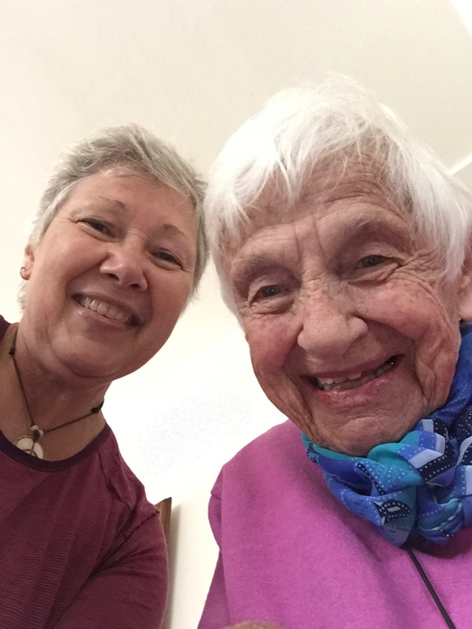 This week too, Loren treated on pizza at his mother’s. I noticed that both she and I were wearing pink tops and blue pants for the evening. I did think to take a photo of us in our nearly matching outfits. Since I just read this week in a Japanese-American’s memoir that this would be called a “pair look,” I can also say I have a another, new, fun way to refer to twin or matching outfits. On another evening I noticed for the first time that Loren’s sister’s rescue cat sometimes joins their Mom on her large comfy chair while she is watching TV, so I also snapped a photo of them together.