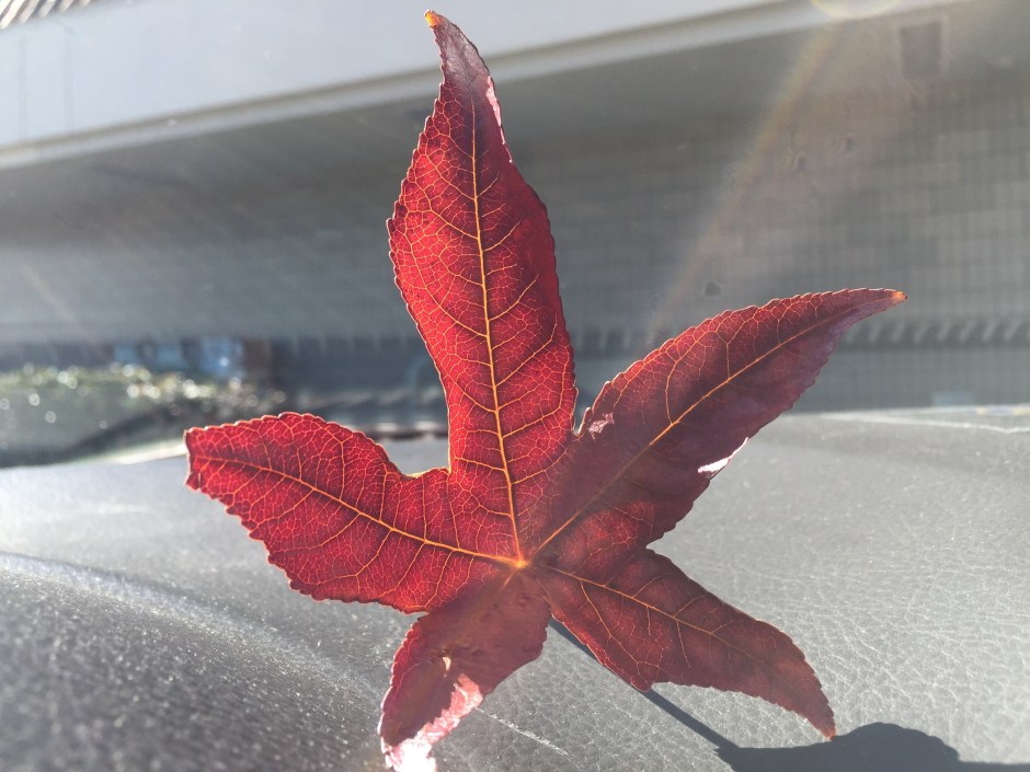 I did manage to capture a photo of a leaf that fell into my lap after I parked at the grocery store. Then I photo’d its sibling colorful leaf found outside my car for fun.